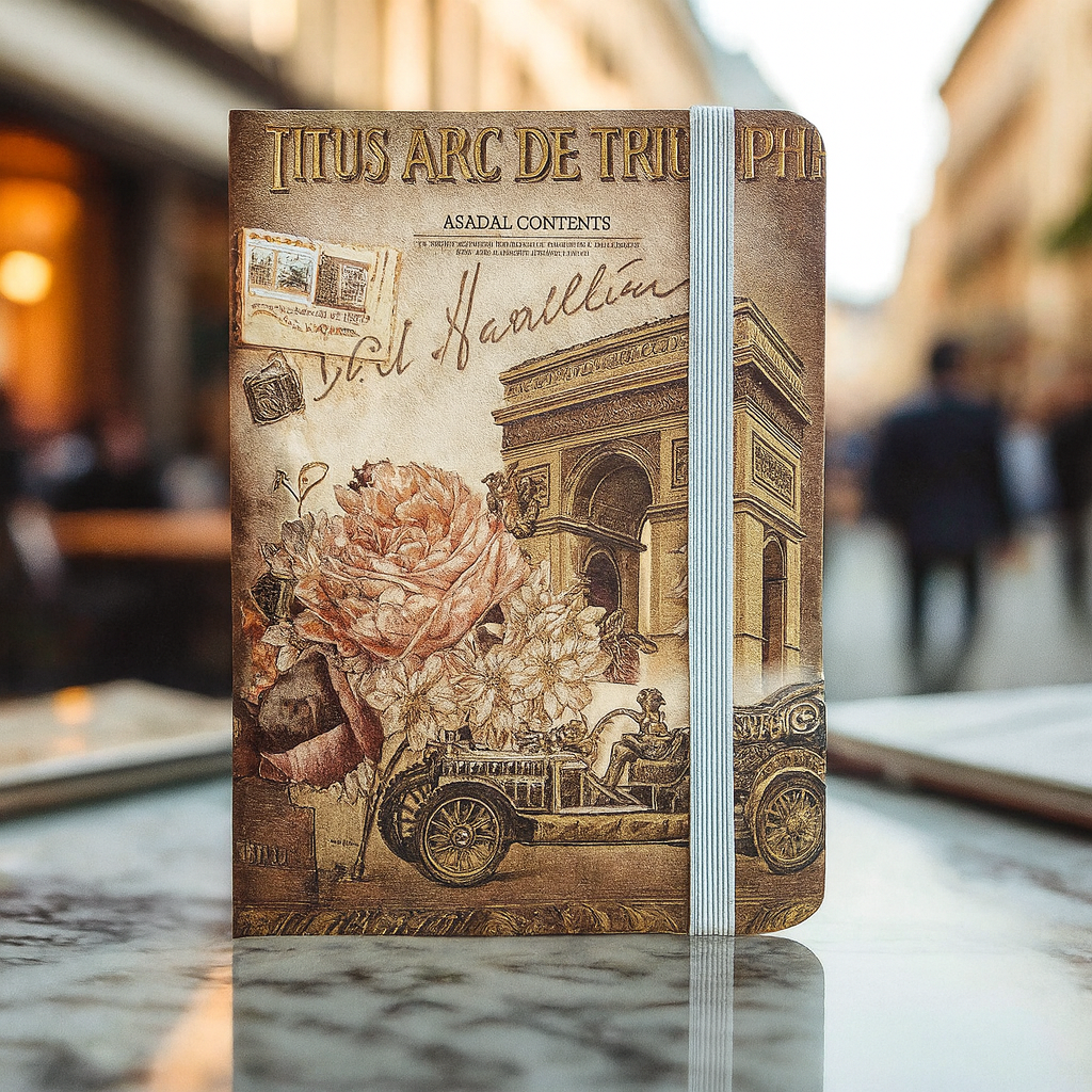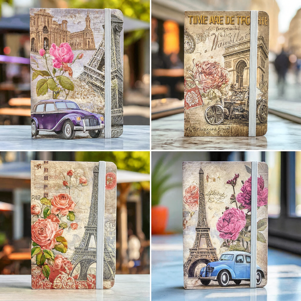 Un homenaje al encanto clásico de París. Estas agendas de tamaño mediano combinan ilustraciones de la Torre Eiffel, flores y autos retro, ideales para quienes disfrutan escribir, planear o regalar detalles llenos de historia y estilo.