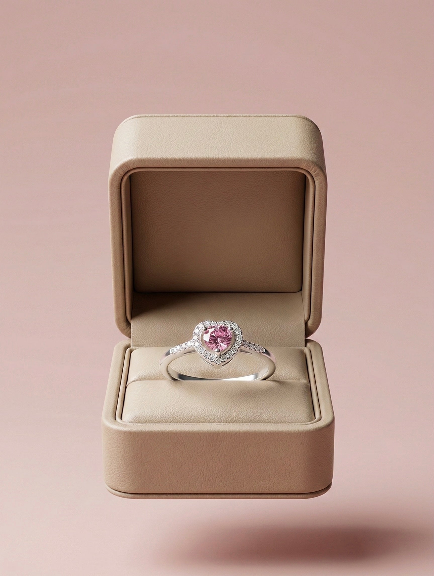 En el centro destaca un zircon rosado talla brillante, engastado en una montura con forma de corazón que potencia su luz y crea un efecto visual encantador. Un halo de microzircones blancos rodea la pieza, añadiendo definición y un resplandor adicional que realza el tono rosado del centro.