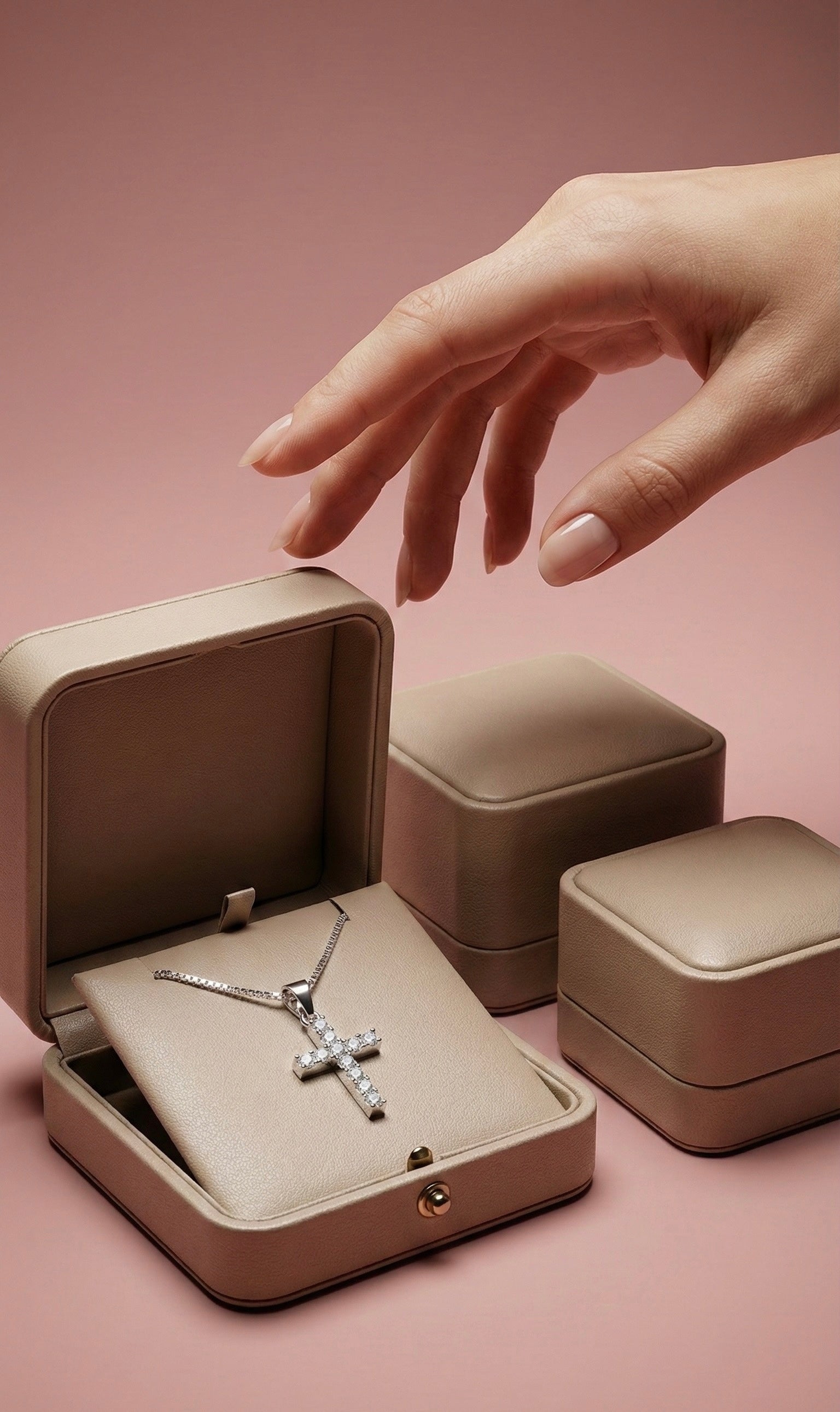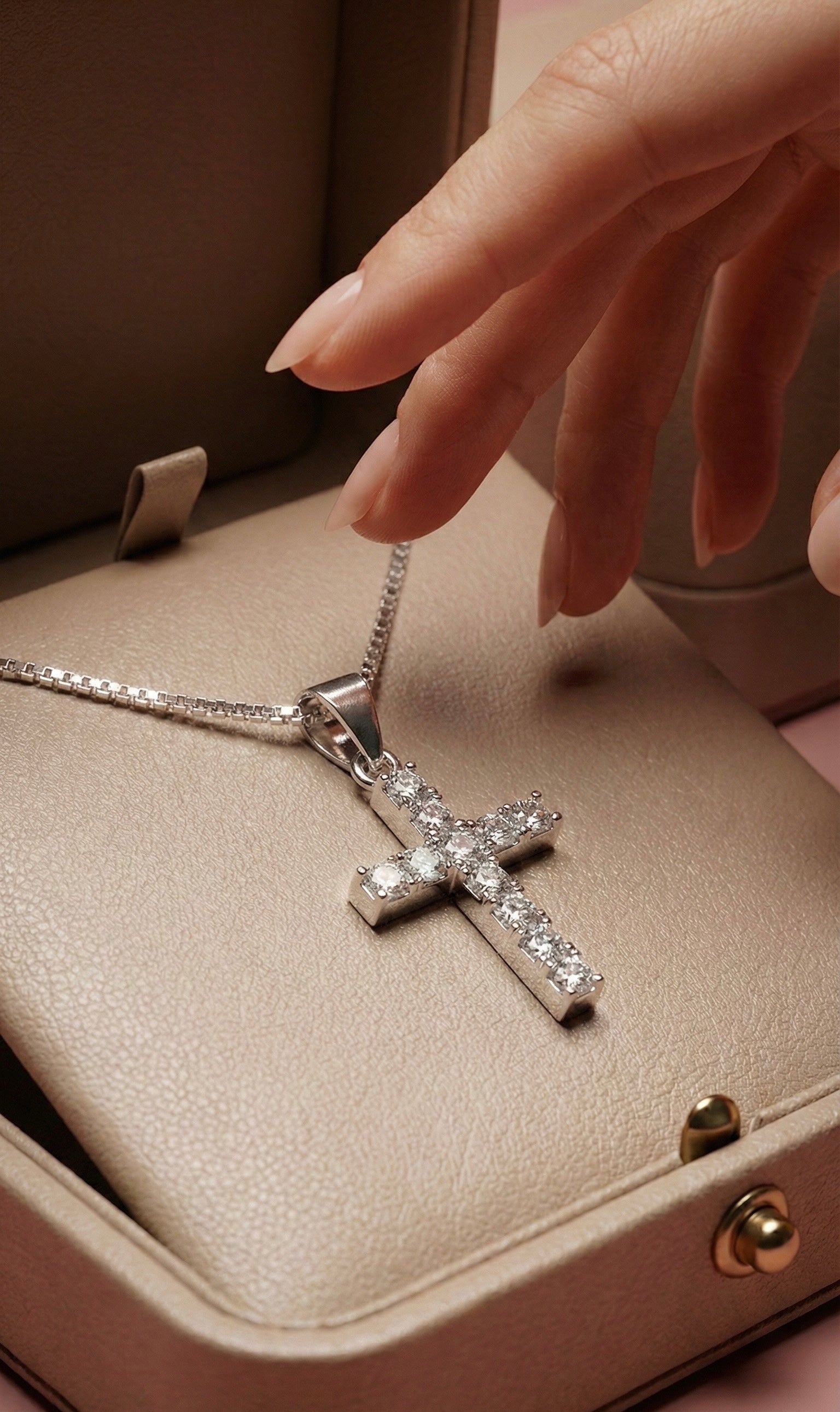 Collar elaborado en plata esterlina ley 925, un material hipoalergénico y de alta durabilidad. Su dije en forma de cruz está compuesto por zircones blancos engastados uno a uno, creando un brillo intenso y delicado que resalta desde cualquier ángulo.