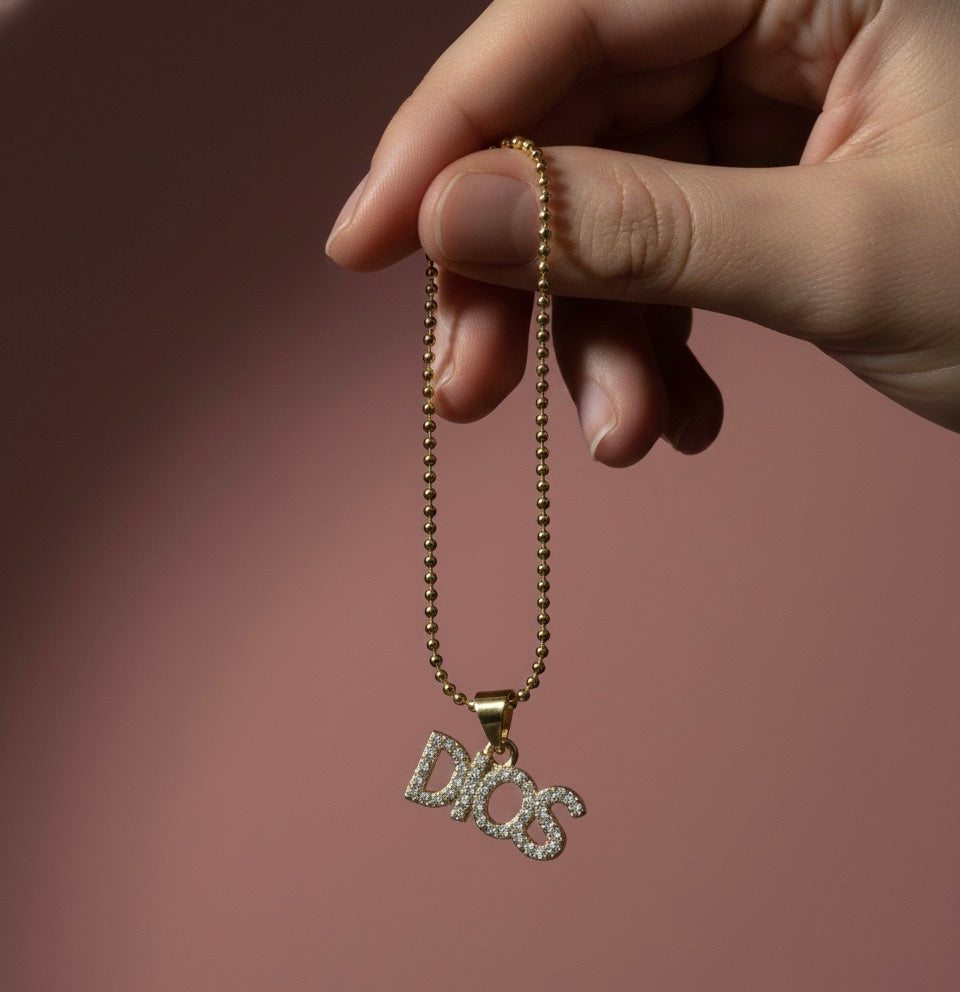 El Collar Golden Shine está elaborado en rodio con baño en oro, acompañado de un dije con la palabra DIOS formada en delicadas letras incrustadas con zircones de alta pureza, que aportan una luminosa elegancia sin excesos.
