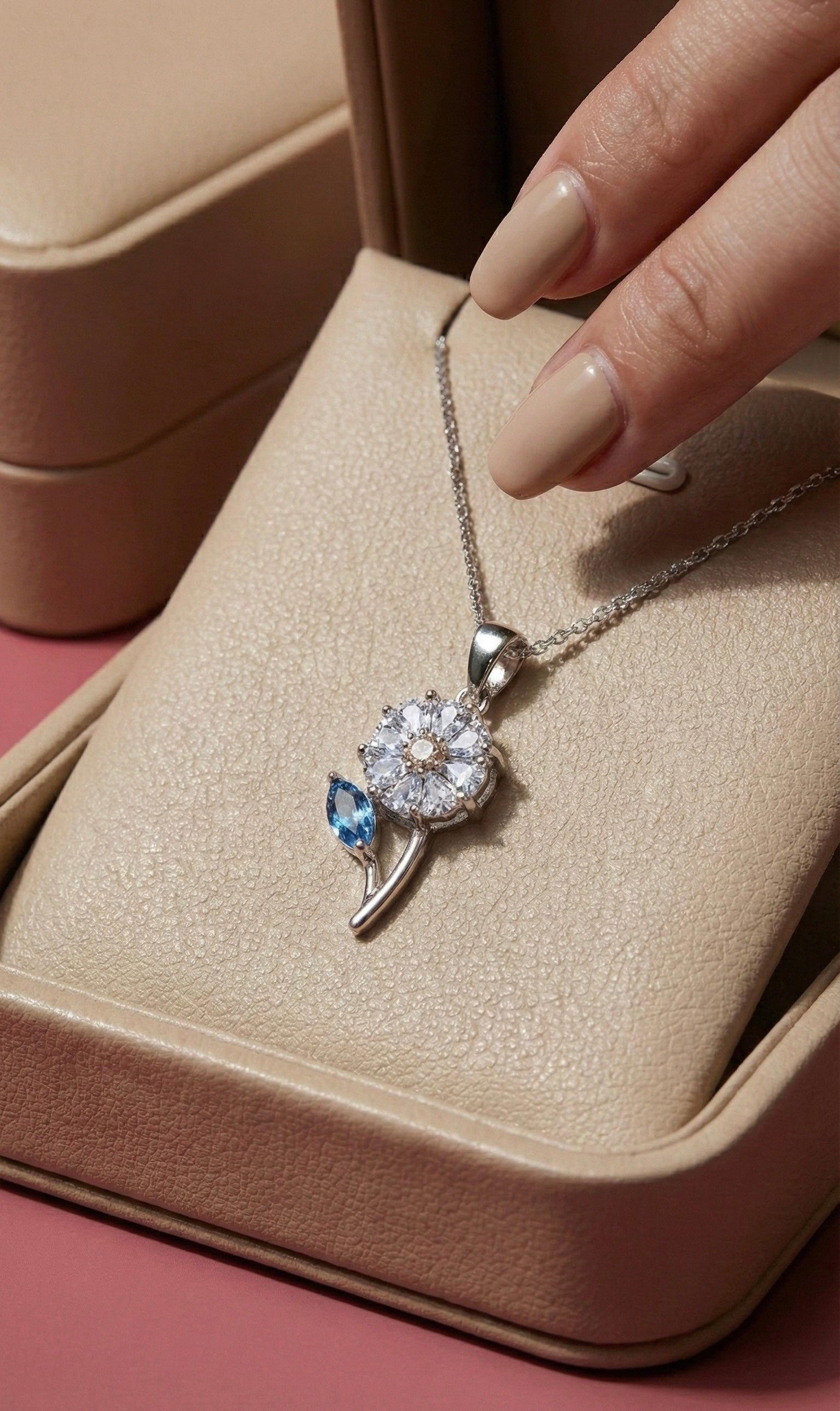 Collar elaborado en plata ley 925, una pieza que expresa elegancia y luminosidad a través de un diseño delicado y atemporal. Su forma floral se realza con zircones finamente engastados, que capturan la luz con un brillo sutil y sofisticado, mientras el detalle en tono azul aporta profundidad y serenidad, evocando calma, armonía y distinción.
