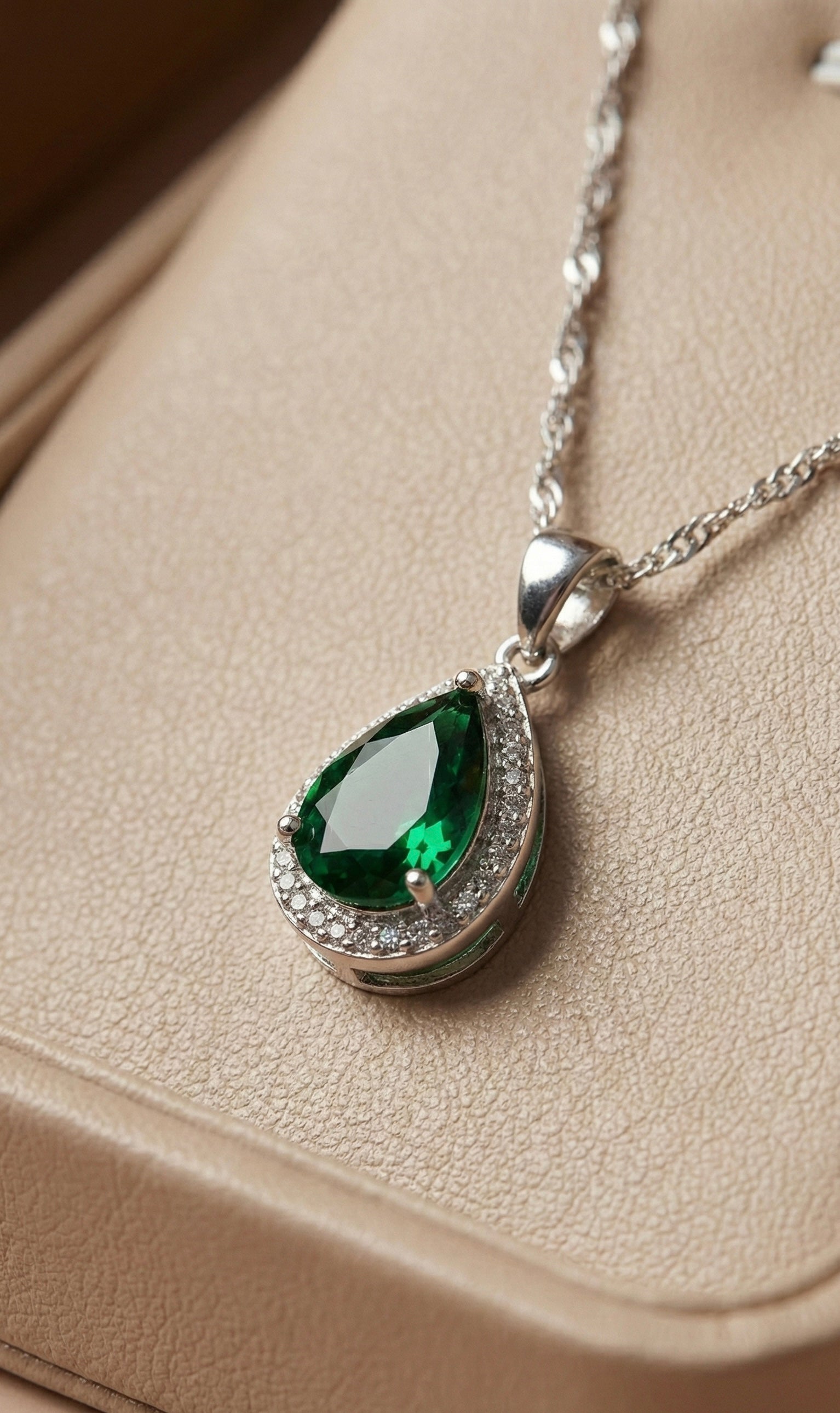 Este collar en plata ley 925 se distingue por su diseño clásico y refinado. La pieza central presenta una piedra verde en corte gota, de brillo profundo y elegante, que evoca la serenidad y la fuerza de la naturaleza. A su alrededor, un delicado halo de zircones cuidadosamente engastados realza la luminosidad de la gema y aporta un equilibrio perfecto entre sofisticación y sutileza.