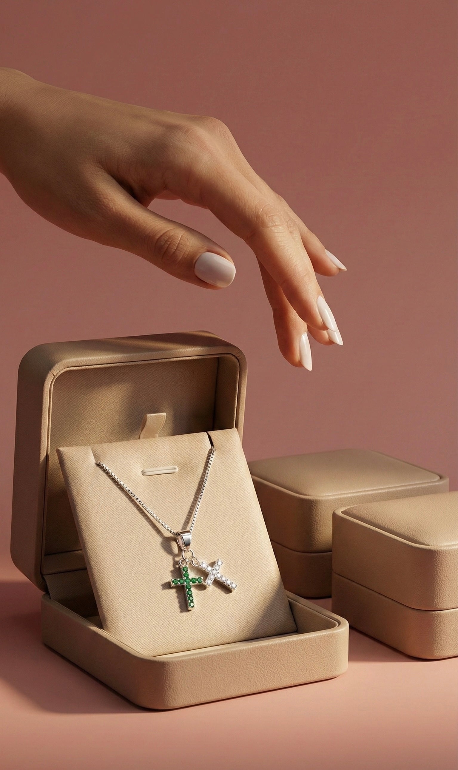 • Una cruz con zircones verdes, símbolo de vida, esperanza y renovación.