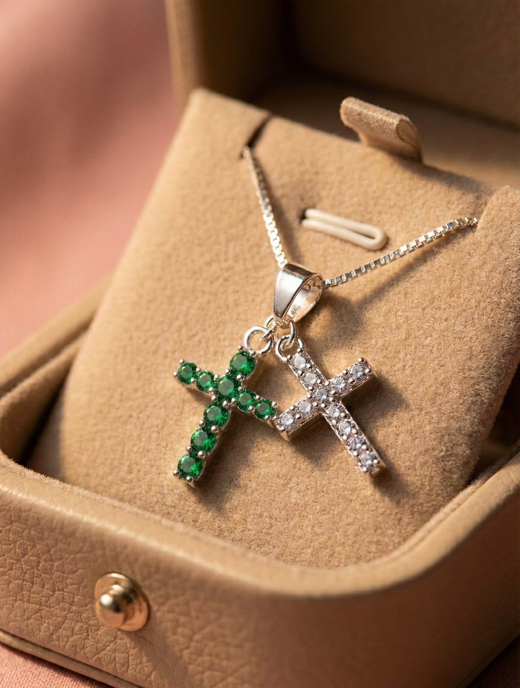 Collar elaborado en plata esterlina ley 925, un material hipoalergénico y resistente que garantiza brillo y durabilidad con el paso del tiempo. Incluye dos dijes en forma de cruz, cada uno con su propio significado y estilo: