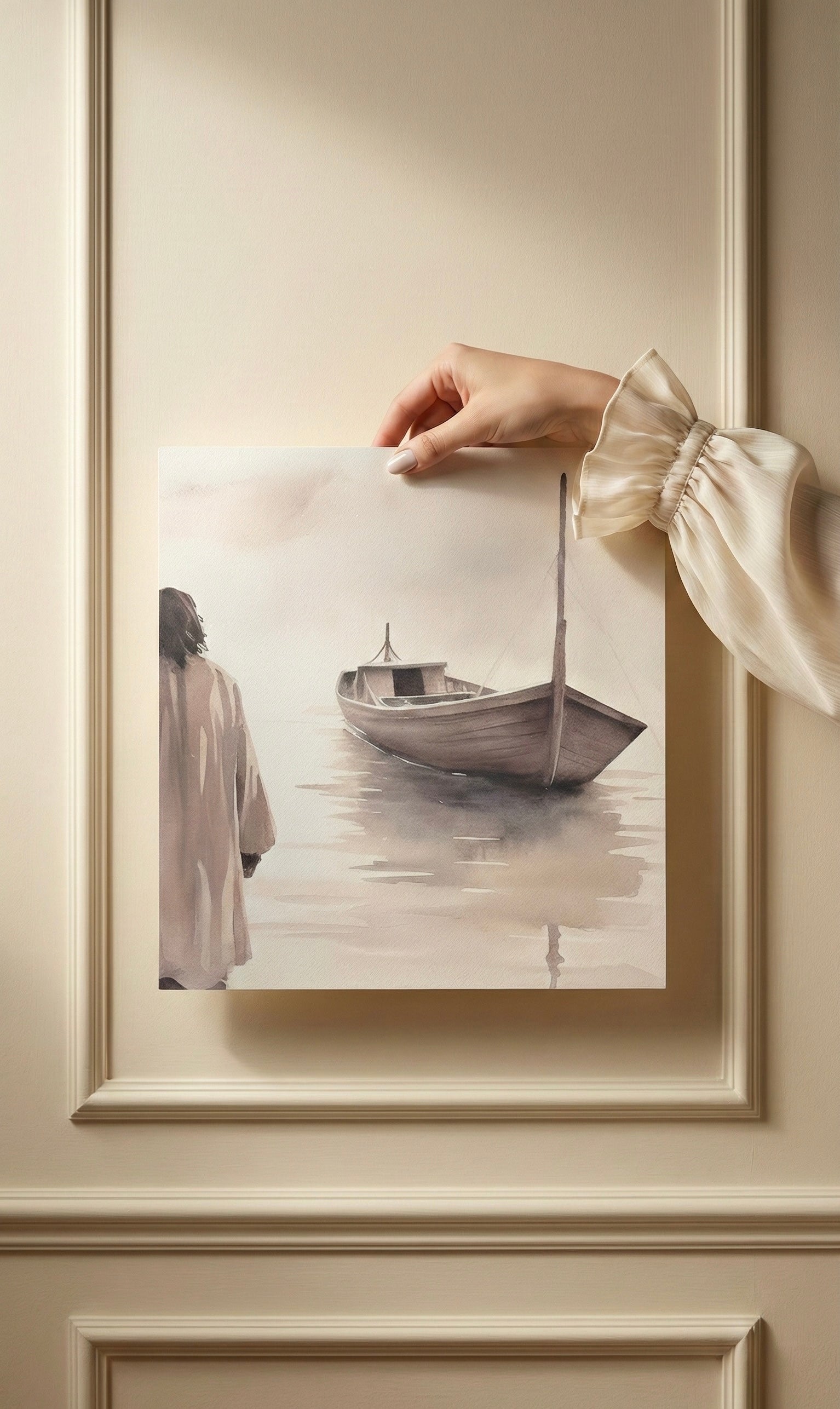 Un cuadro en madera de 30×30 cm, creado para transmitir serenidad, profundidad y propósito. La escena muestra a Jesús de pie sobre las aguas, contemplando una barca que reposa en calma, como una invitación divina a avanzar, confiar y seguir su llamado.